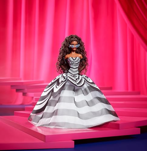 Barbie Signature Doll, 65th Anniversary Collectible with Brown Braided Hair, Black and White Gown, Sapphire Gem Earrings and Sunglasses